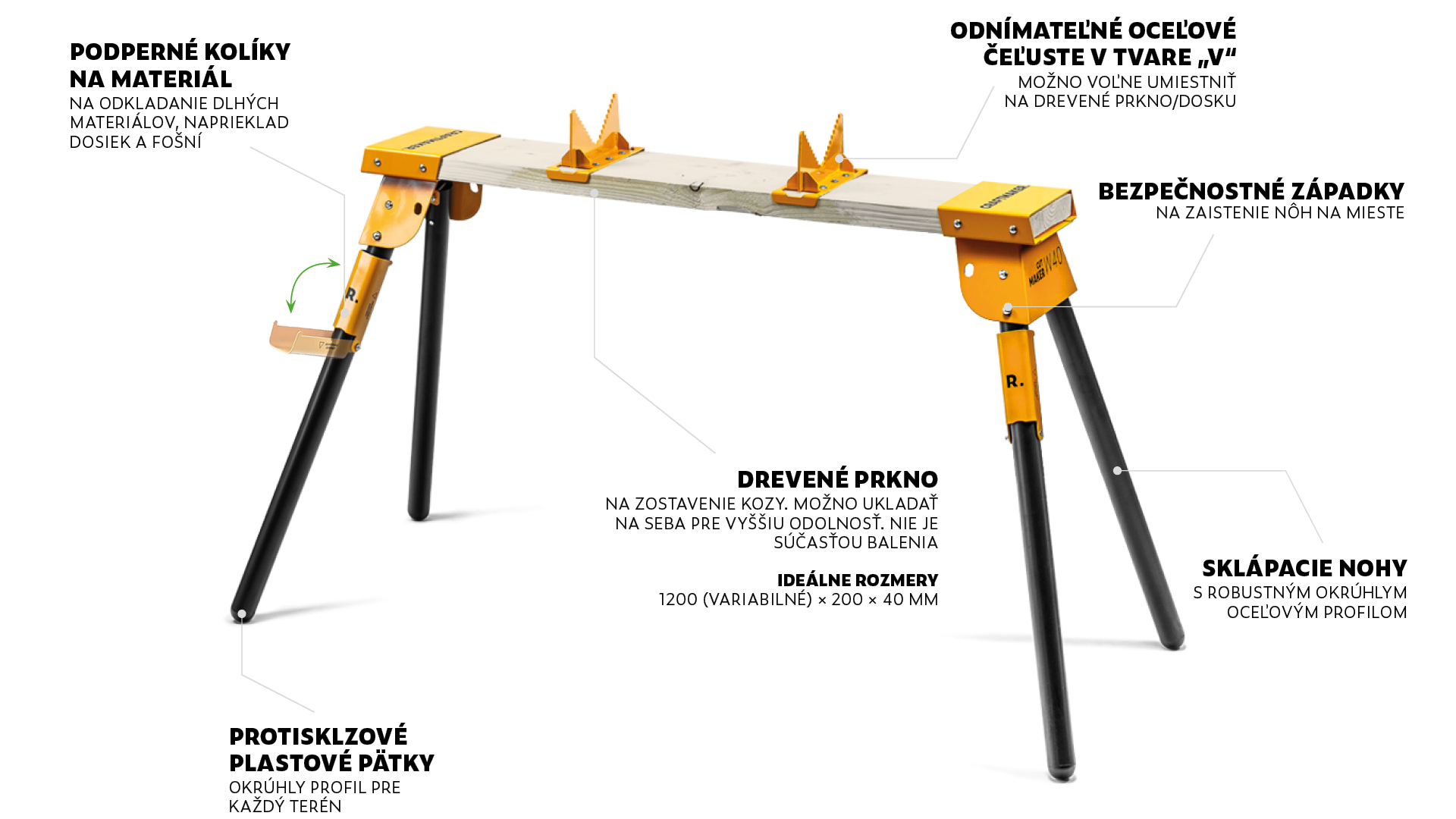 Robustná oceľová koza CRAFTMAKER Cut Maker W40 je ideálna nielen na rezanie dreva – s typickým čierno-žltým dizajnom CRAFTMAKER. Oceniť môžete možnosť výmeny nosného hranola*, rovnako aj nastaviteľné rozmiestnenie čeľustí, ktoré je možné ľahko premiestniť vďaka upevneniu oceľovými skrutkami. Ďalším praktickým prvkom sú výklopné žlté opierky na materiál. Po demontovaní oceľových čeľustí z drevenej základne môžete W40 využiť aj ako provizorný pracovný stôl alebo podporné kozy ľubovoľnej dĺžky. Jednoduché rozkladanie aj skladanie. Stabilná koza na rezanie vhodná pre profesionálnych remeselníkov aj domácich majstrov.
