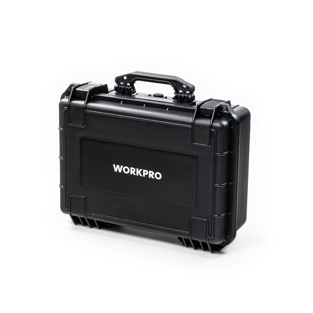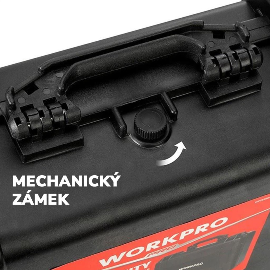 Uzamykateľný box - kufor WORKPRO s plastovou rukoväťou a odolnosťou proti vode a nárazom. Vodotesnosť podľa normy IPX5. Plastová škrupina vyvinutá proti poškodeniu nárazom. Tvarovateľná pamäťová pena vo vnútri boxu.