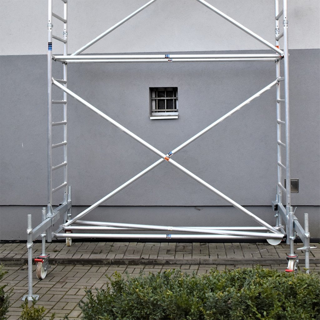 K pojazdnému lešeniu MOBILO s pracovnou výškou 6,6 metrov a vyšším automaticky pridávame vysúvacie teleskopické podpery, ktoré dodatočne zvýšia odolnosť Vašej veže voči prevráteniu. Podpery je možné nezávisle na sebe plynule vysunúť do niekoľkých pozícií, čo oceníte hlavne v prípade, že bude jedna strana lešenia umiestnená priamo pri stene. Pätky na koncoch podpier je navyše možné výškovo nastaviť, pokiaľ sa rozhodnete lešenie umiestniť na nerovný terén.