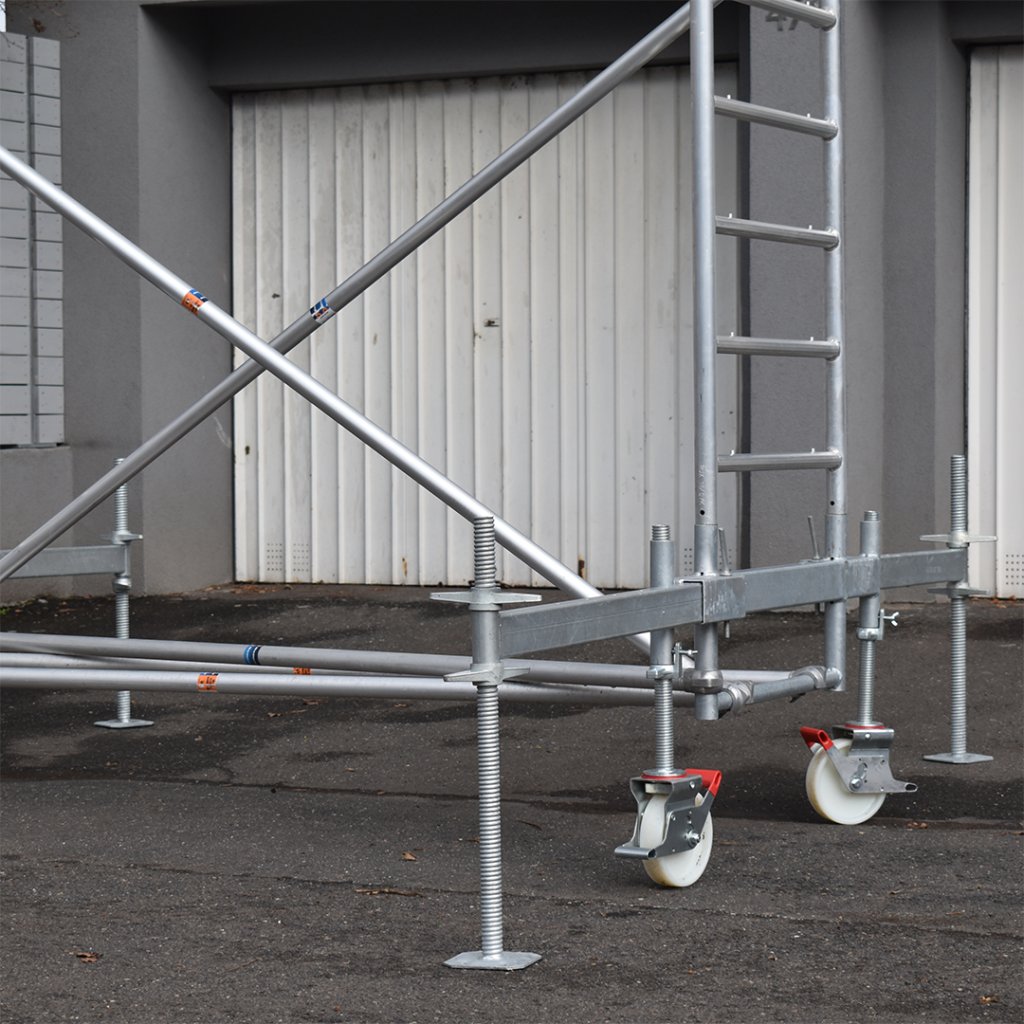 K pojazdnému lešeniu MOBILO s pracovnou výškou 6,6 metrov a vyšším automaticky pridávame vysúvacie teleskopické podpery, ktoré dodatočne zvýšia odolnosť Vašej veže voči prevráteniu. Podpery je možné nezávisle na sebe plynule vysunúť do niekoľkých pozícií, čo oceníte hlavne v prípade, že bude jedna strana lešenia umiestnená priamo pri stene. Pätky na koncoch podpier je navyše možné výškovo nastaviť, pokiaľ sa rozhodnete lešenie umiestniť na nerovný terén.