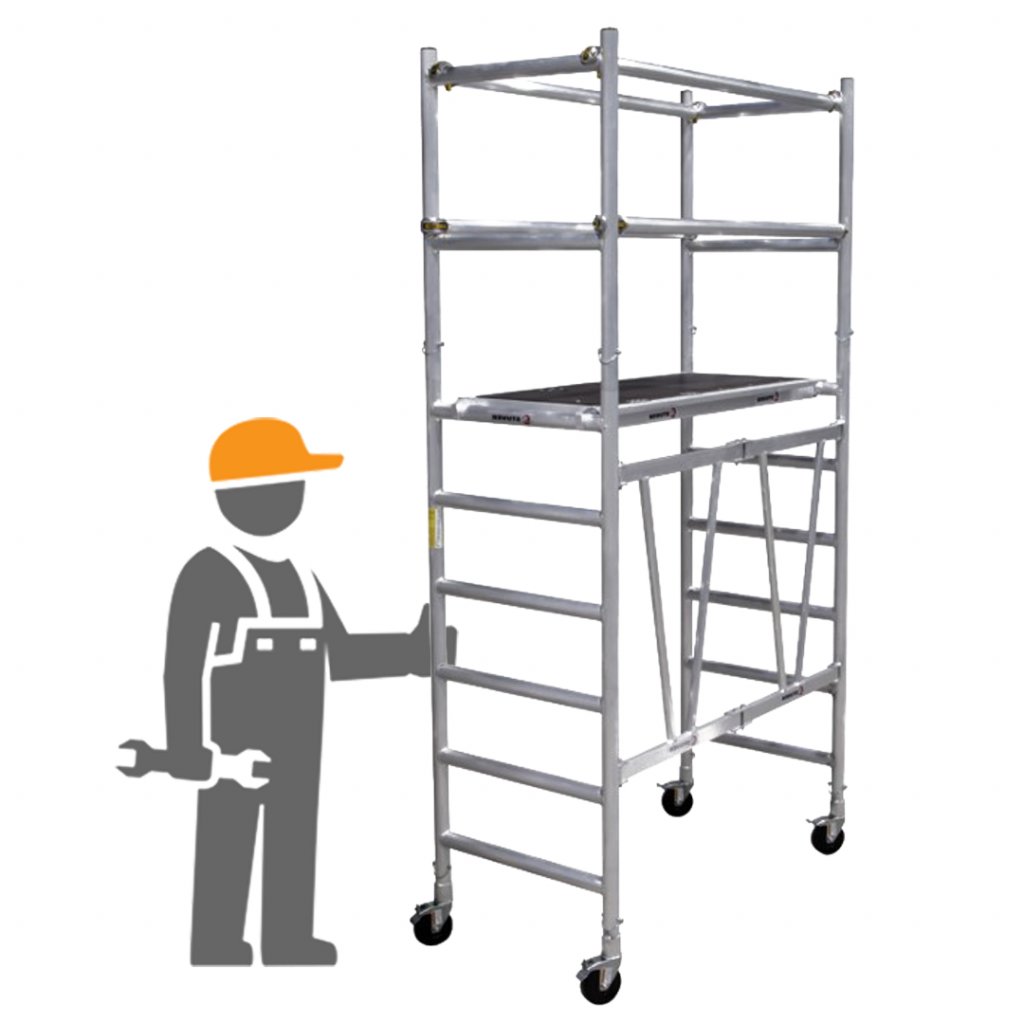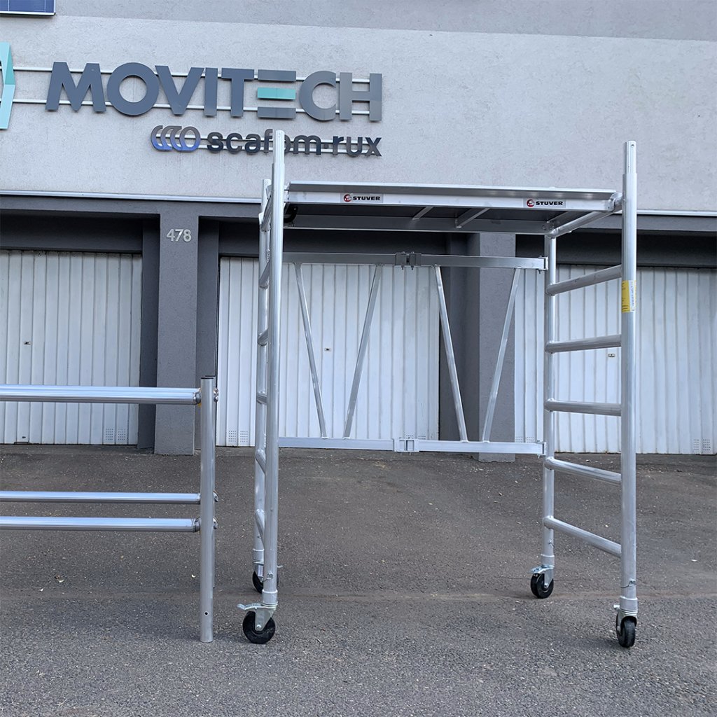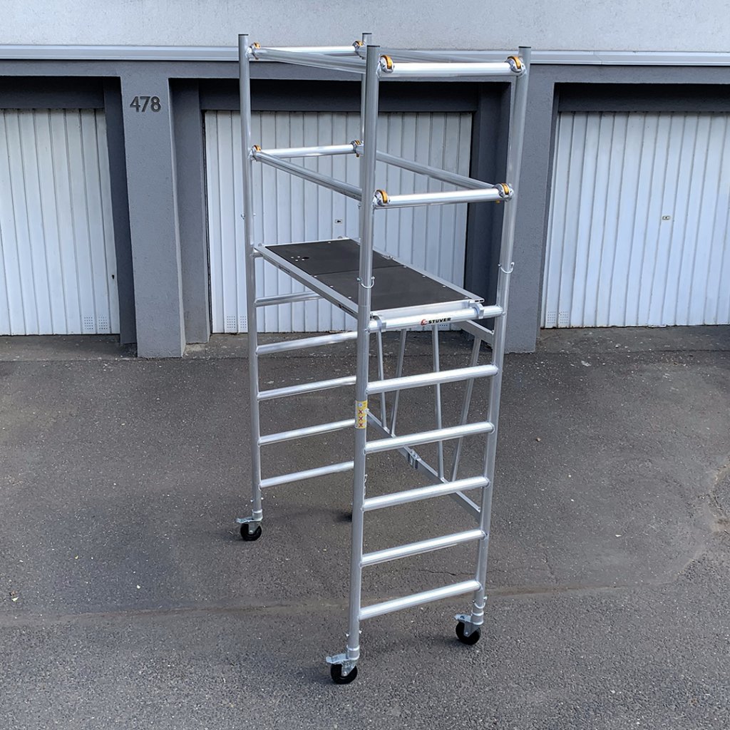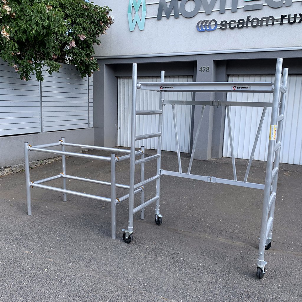Hliníkové mini-lešenie Stuver ja skladacie pojazdné lešenie vhodné do interiérov aj exteriérov. Svojim vlastníkom ponúkne nízku hmotnosť a robustnú konštrukciu. K jeho stavbe nebudete potrebovať žiadne náradie a manipulovať s ním pohodlne zvládne jedna osoba. Toto lešenie nemá diagonálnu tyč, ktorú môžete nájsť u konkurenčných lešení, a ktorá bude zároveň tým najdlhším prvkom konštrukcie, takže ho rýchlo a jednoducho zložíte do veľmi kompaktných rozmerov. Zložená konštrukcia sa zmestí do väčšiny automobilov so sklopnými sedadlami.