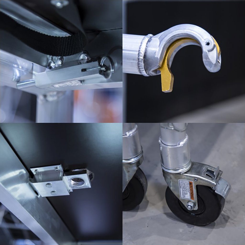 Možnosť jednoducho prechádzať dverami miestností ocení každý remeselník - lešenie tejto konštrukcie je vhodné nie len pre maliarov, elektrikárov či obkladačov, ale aj pre osobné použitie pri drobných opravách okolo záhrady. Či údržbe domu. Konštrukcia tohto lešenia nehrdzavie. Podlahy sú z protišmykového materiálu.