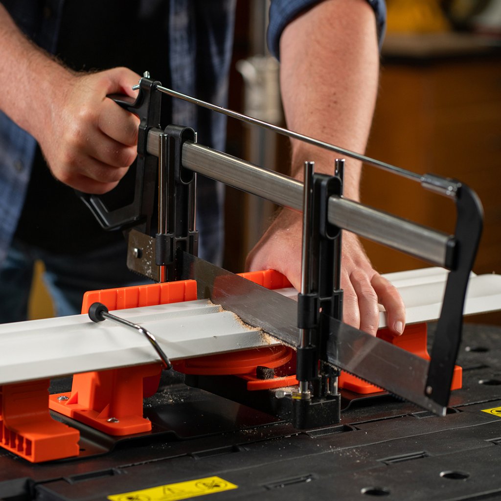 Najlepšie táto píla funguje v spojení s rozkladacím pracovným stolom PONY JORGENSEN, ktorý je vybavený aretačnými zarážkami.