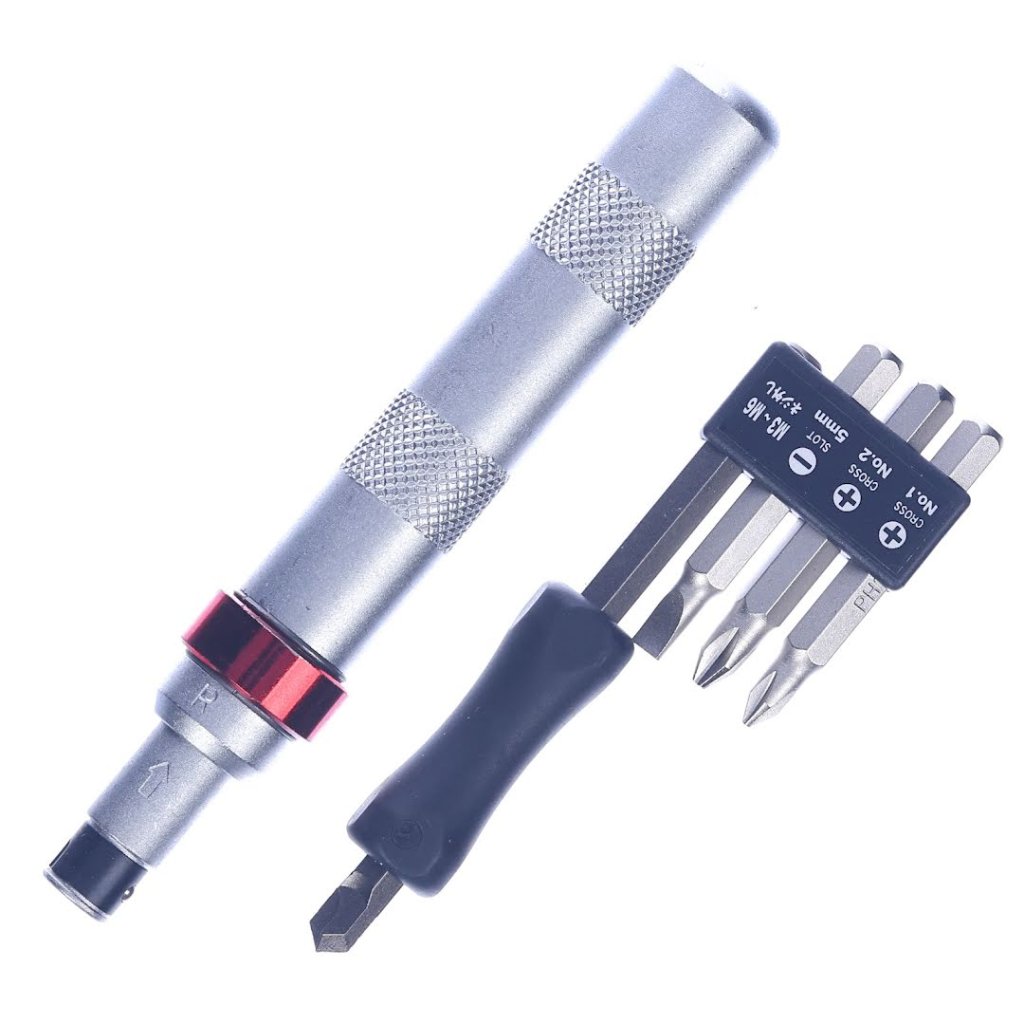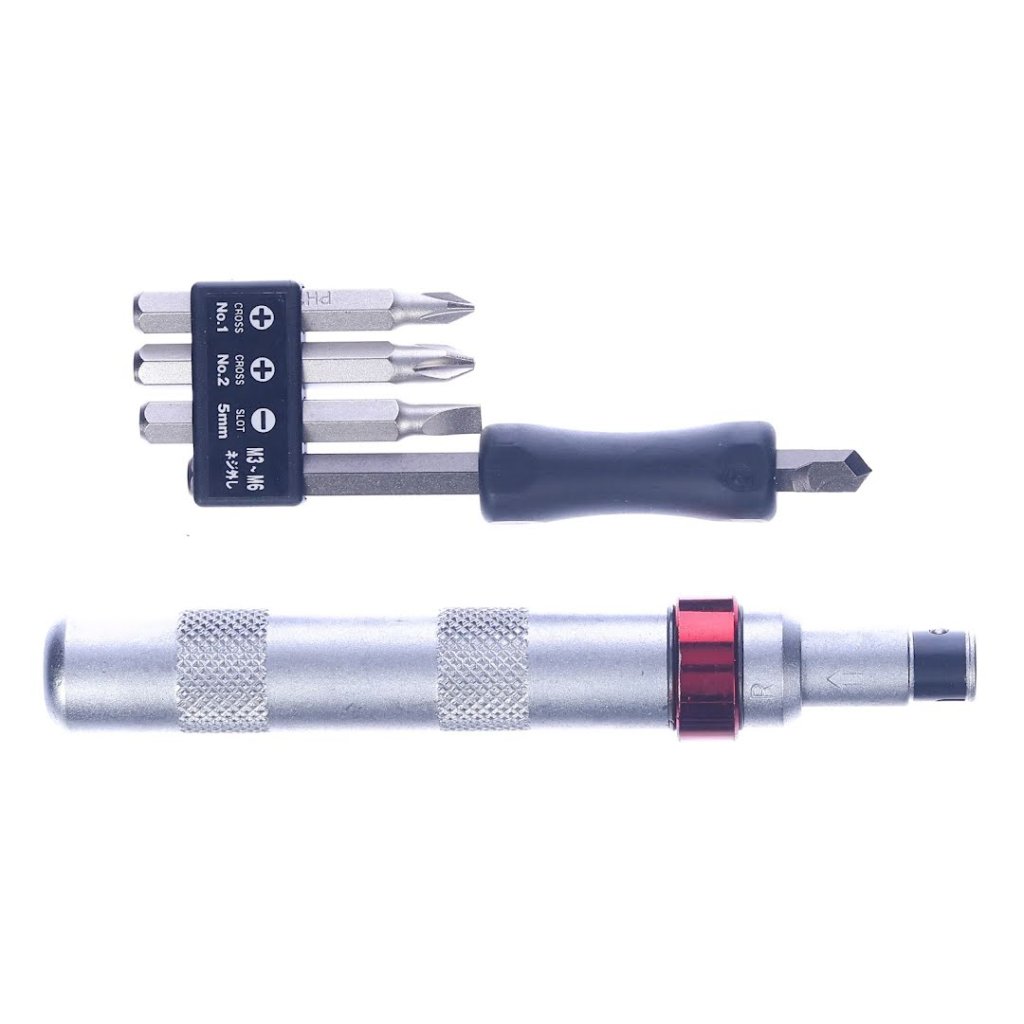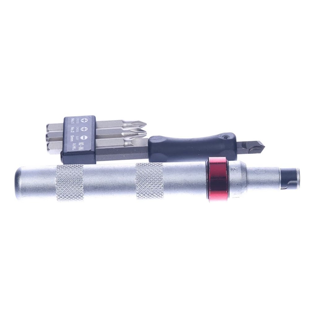 Ručný rázový skrutkovák značky SK11 a sada bitov sú navrhnuté na odstraňovanie skrutiek s poškodenými alebo zničenými hlavami. Tento nástroj premieňa silu úderu kladivom na rotačnú silu, čím uľahčuje uvoľňovanie pevne dotiahnutých skrutiek. Je vybavený špecializovanými bitmi, vrátane PH1, PH2, S5 a 100 mm pre poškodené krížové skrutky, vhodnými pre veľkosti skrutiek M3 až M6. Upozorňujeme, že bit na poškodené skrutky by sa nemal používať na veľmi tvrdé skrutky, ako sú hrubo závitové, samorezné skrutky alebo vŕtacie skrutky, aby sa predišlo poškodeniu bitu.