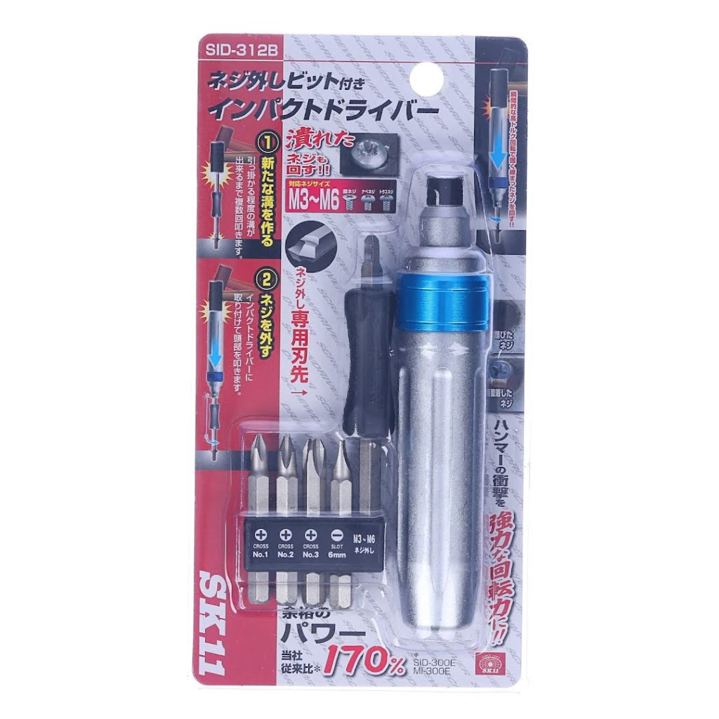 Ručný rázový skrutkovák značky SK11 a sada bitov sú navrhnuté na odstraňovanie skrutiek s poškodenými alebo zničenými hlavami. Tento nástroj premieňa silu úderu kladivom na rotačnú silu, čím uľahčuje uvoľňovanie pevne dotiahnutých skrutiek. Je vybavený špecializovanými bitmi, vrátane PH, PH2, PH3, S6 a 100mm pre poškodené krížové skrutky, vhodnými pre veľkosti skrutiek M3 až M6. Upozorňujeme, že bit na poškodené skrutky by sa nemal používať na veľmi tvrdé skrutky, ako sú hrubo závitové, samorezné skrutky alebo vŕtacie skrutky, aby sa predišlo poškodeniu bitu.