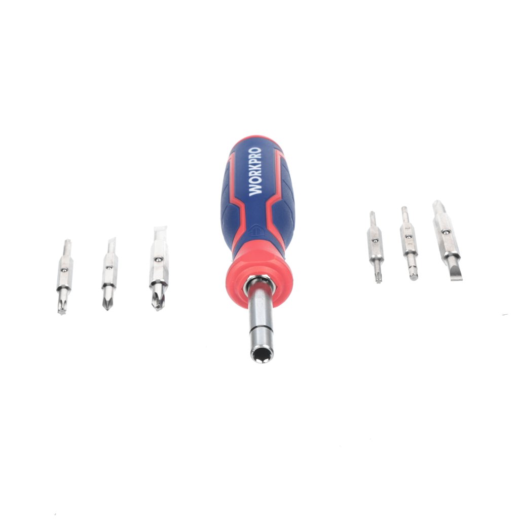 Sada skrutkovača s nástavcami WORKPRO je všestranná sada určená pre každú vašu potrebu v oblasti skrutkovania. Vďaka vymeniteľnému hrotu môžete jednoducho vymieňať bity a telo a tak prispôsobiť prácu vašim potrebám. V sade nájdete obojstranné hviezdicové, krížové ale aj ploché hroty. Bity sa osadzujú na priemer 6,35 mm.