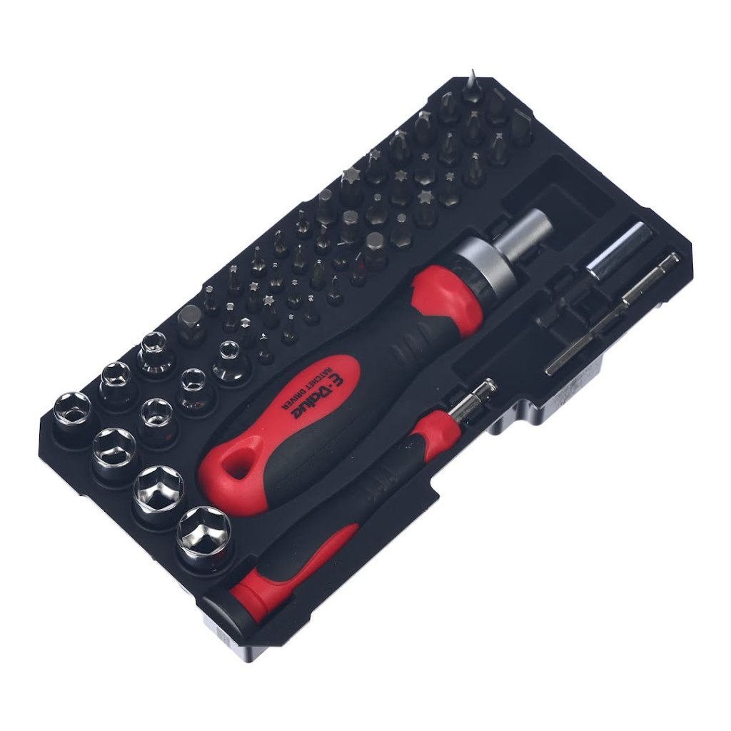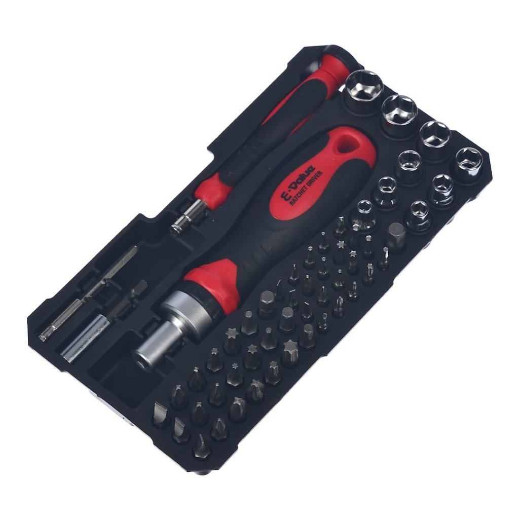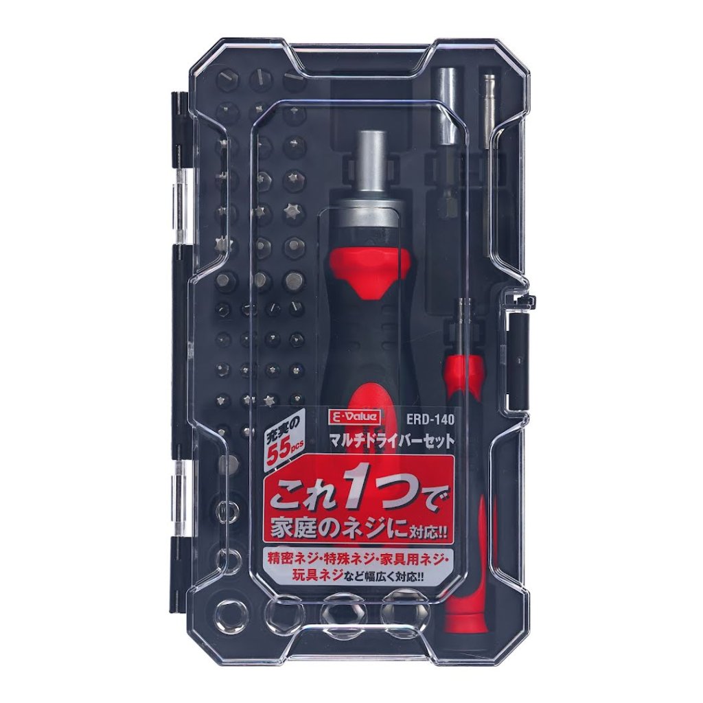Sada skrutkovača s račňou, vymeniteľnými bitmi a nástrčnými kľúčmi E-VALUE - ERD-140