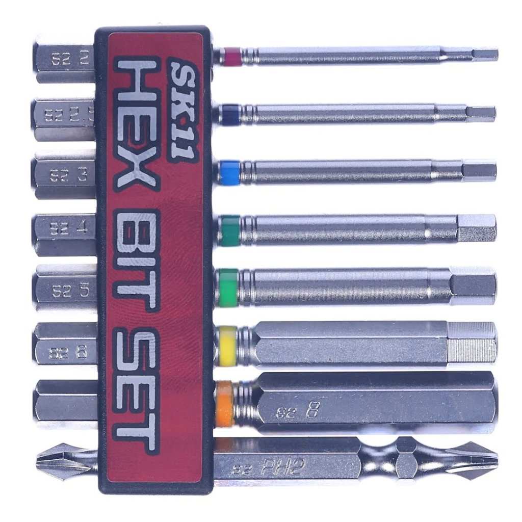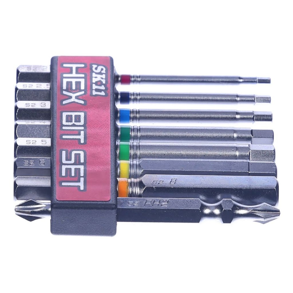Sada so šesťhrannými bitmi SK11 je univerzálnym doplnkom do každej dielne, navrhnutým na jednoduché uťahovanie šesťhranných skrutiek. Táto sada obsahuje sedem rôznych veľkostí šesťhranných bitov plus jeden krížový bit, všetko pohodlne usporiadané v kompaktnom puzdre s rozmermi 80 × 8 × 65 mm a hmotnosťou 120 g. Každý bit má farebné označenie pre rýchlu identifikáciu, čo zvyšuje efektivitu vašej práce. So šesťhranným držiakom 6,35 mm sú tieto bity kompatibilné s elektrickým a ručným náradím.