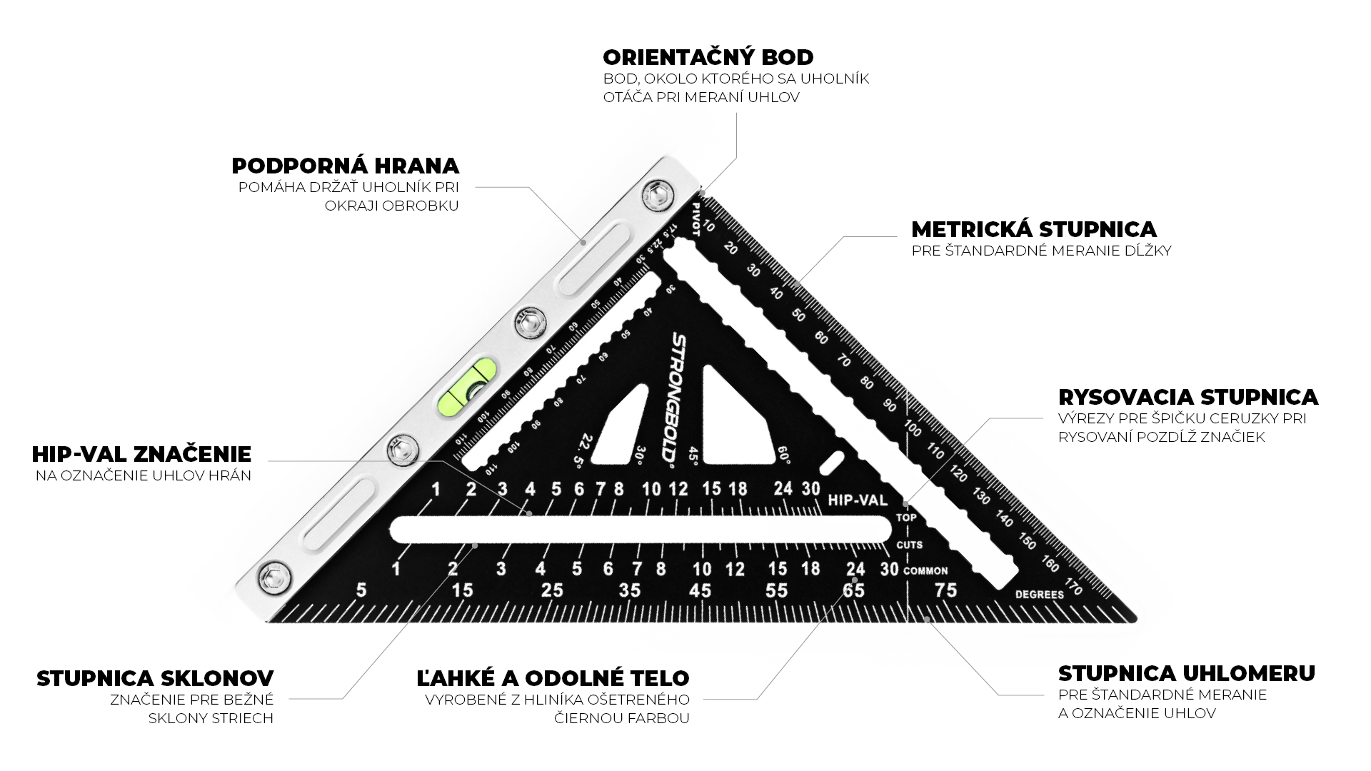 Tesársky uholník StrongSquare SQ730 od značky STRONGBOLD® je ideálny pre profesionálnych remeselníkov. Je vybavený na prácu v rôznorodých prostrediach a umožňuje ľahké dokončenie viacerých úloh. Pokročilé konštrukčné prvky poskytujú maximálnu funkčnosť. Uholník je odolný voči štrku a prachu v náročnom teréne a pri každodennom používaní. Telo je z odolného hliníka ošetrené čiernou práškovou farbou s presne vyznačenou stupnicou a uhlami v metrickej sústave.